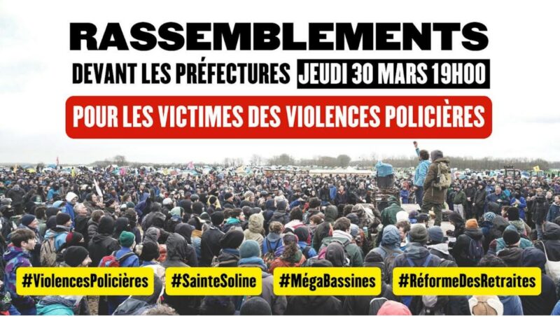 jeudi à 19h devant toutes les (sous)-préfectures. En soutien aux 2 manifestants dans le coma, aux blessées de Sainte-Soline et du mouvement des retraites, pour la fin des violences policières, pour la dissolution de la brav-m et l’interdiction des grenades GM2L.