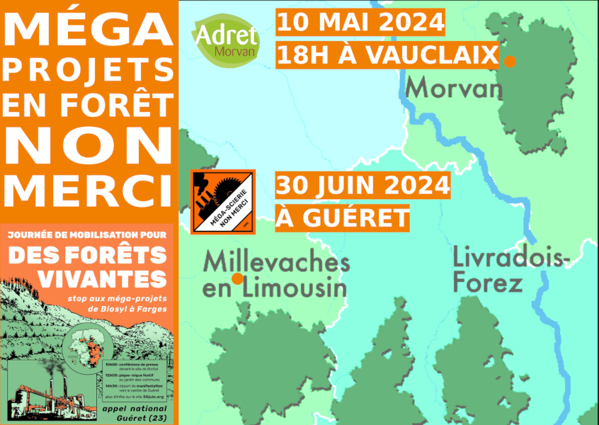 Le Carrouège Carrefour de Vauclaix, Vauclaix, FranceVendredi 10 mai à partir de 18h, Adret Morvan reçoit au Carrouège deux membres des collectifs en lutte contre deux méga-projets qui menacent la forêt, au nord et au sud du Plateau de Millevaches. Il y a dix ans, la lutte dont est née Adret Morvan empêchait l’installation d’une mégascierie et d’un incinérateur. Les destructeurs […]