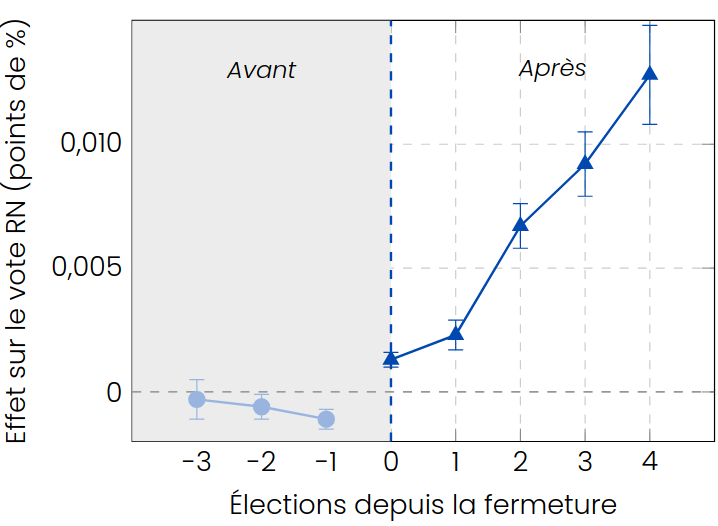 Le graphique ci-contre montre l’effet en moyenne des fermetures de bars-tabacs sur le vote RN aux élections législatives. Les effets sont trois fois plus forts en zone rurale (+1,3 point pour les législatives, +3,3 pour les présidentielles) qu’en zone urbaine (+0,3 et +1,1 respectivement).