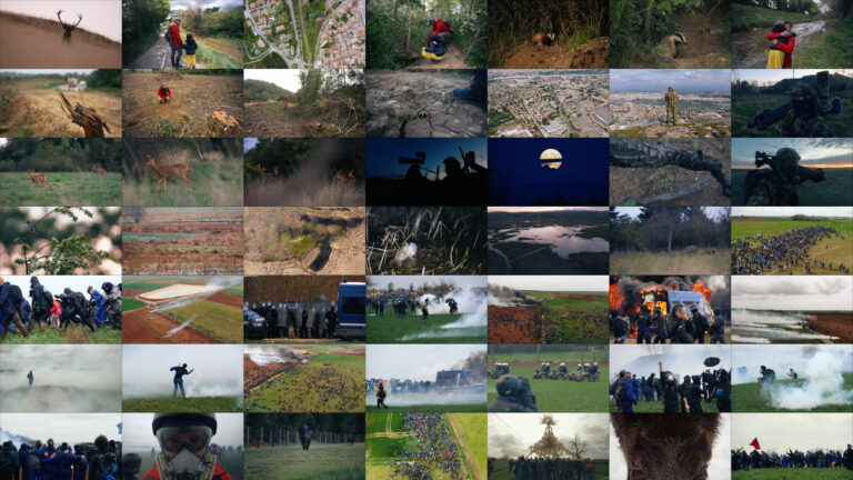 On voit alors le canon à eau entrer en action. Les manifestants s’approchent de la bassine se tenant par la main, en ligne. Derrière les grilles de clôture se tiennent les gendarmes mobiles, devant leur véhicule, face aux manifestants. Ils distribuent à tout-va des grenades lacrymogènes. Je suis content d’avoir prévu lunettes de piscine, masque FFP2 et sérum physiologique. Une fumée noire et épaisse s’élève alors. D’où nous sommes, nous ne pouvons en distinguer la cause, et nous verrons après plusieurs véhicules de gendarmerie en feu. Les grenades lacrymogènes tombent sans discontinuer. Il faut alors se précipiter pour les couvrir de terre dans ce champ labouré et en éviter la diffusion du gaz. Un véhicule blindé arrive en appui aux gendarmes. Un autre type de grenade est ensuite utilisé, qui explose en l’air en dispersant plusieurs sous-grenades lacrymogènes. Enfin, cerise sur le gâteau, arrive le temps des grenades de désencerclement. J’apprécie alors les bouchons d’oreille dont je me suis muni.